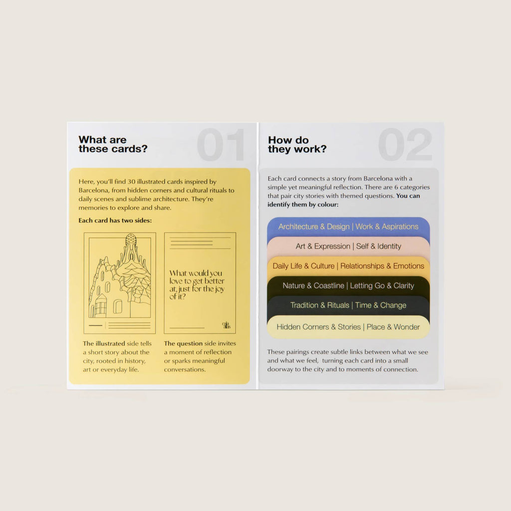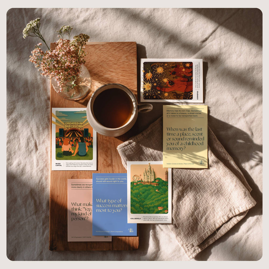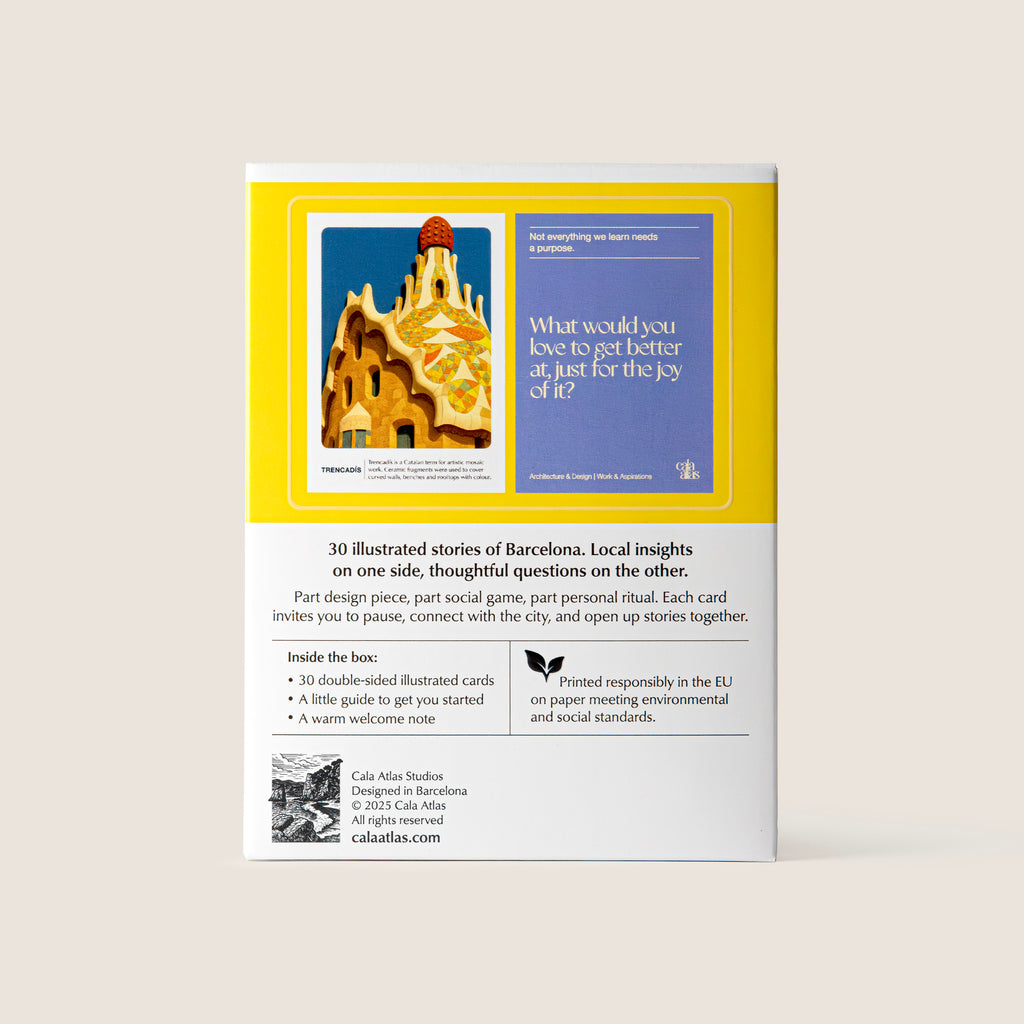 Each card has two sides. The illustrated side shares a short, true story about Barcelona, something curious, hidden or rarely seen. The other side transforms that story into a question or reflection, inviting you to think, play and connect in your own way.