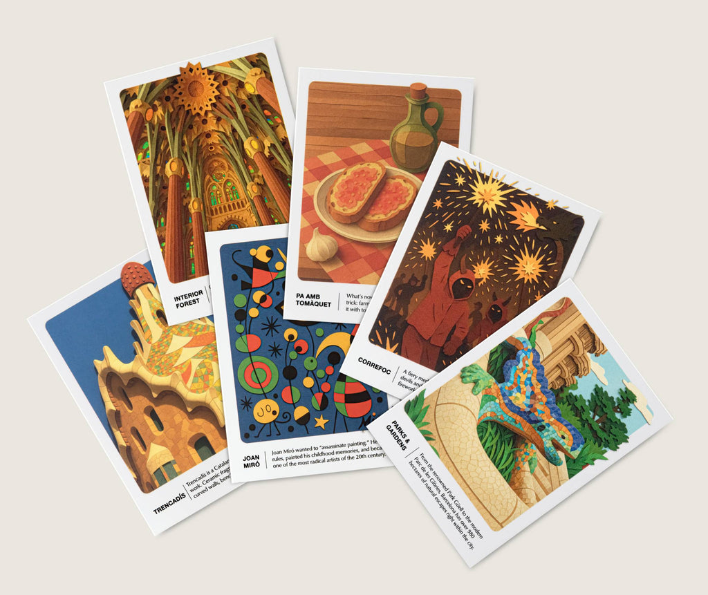 From architecture to traditions, from art to daily life, the deck brings together six themes that uncover different sides of Barcelona. Each card reveals a detail or story that invites you to see the city with new eyes, to learn, feel and connect beyond what’s familiar.