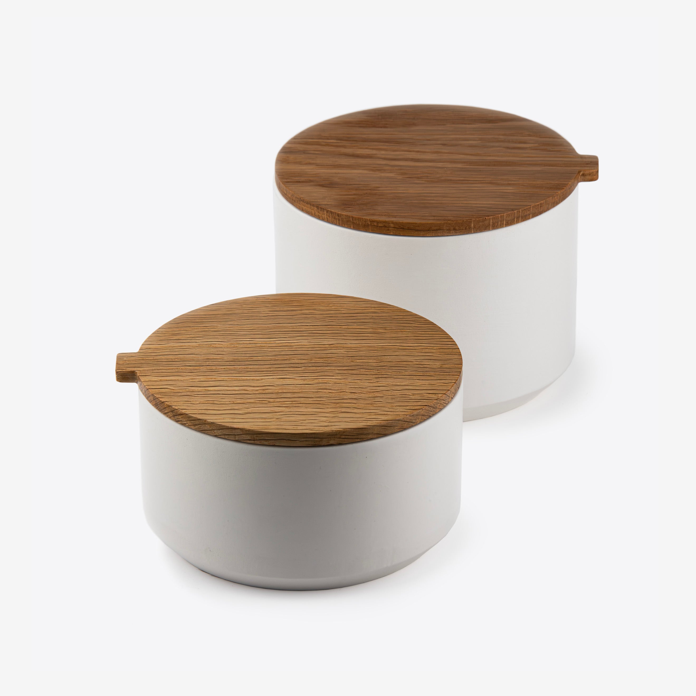 - Solid Oak wood for the lid. White matte ceramic for the body.